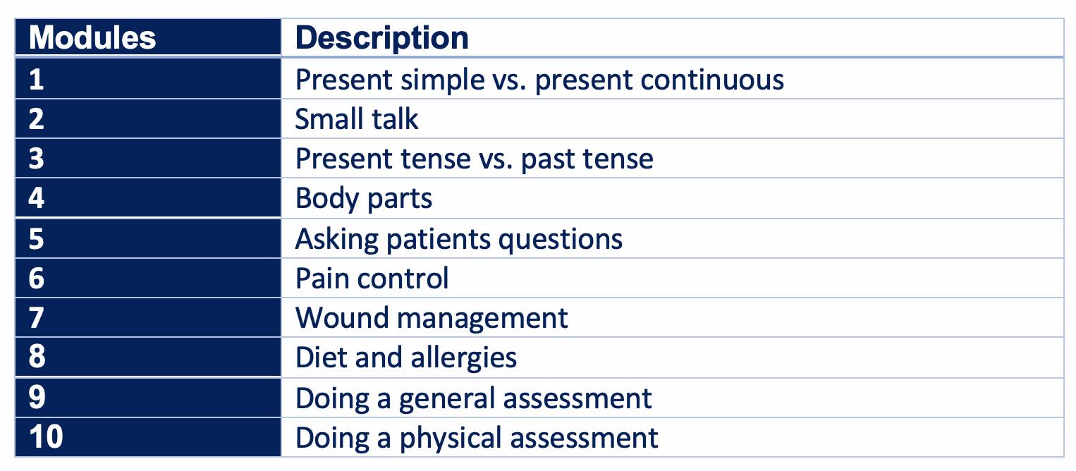 English for Nursing is a mini course that has it all. With 10 modules, it is packed with everything — not necessarily that you need to know — but that you need to say when nursing. That's right! This is a communication course so that you can interact with your patients; ask them how they are feeling, perform a physical check up, ask questions about their medical history, make small talk and discuss topics ranging from medical insurance to diet and exercise.