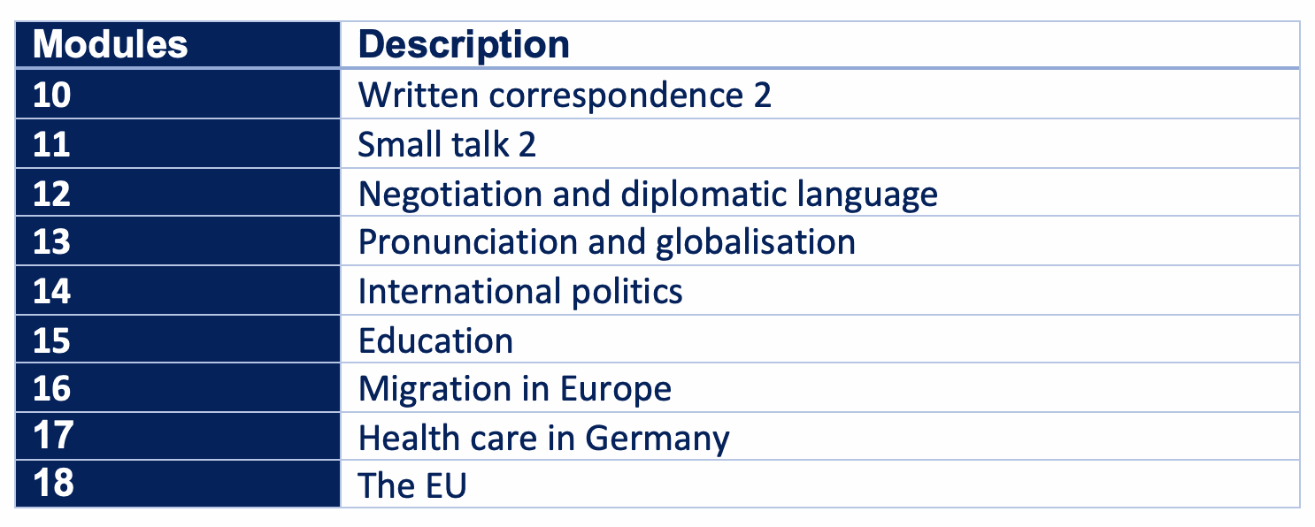 Englisch für politische Verwaltung hat alles. Hier finden Sie es auf 9 Module gekürzt. Wenn Sie Beamte sind, in der politische Verwaltung tätig sind oder auch selber politisch engagiert sind, dann sind Sie hier richtig. Das Ziel ist es, Englisch zu lernen und dabei eine Menge über die Businesswelt zu lernen – daher der Name!